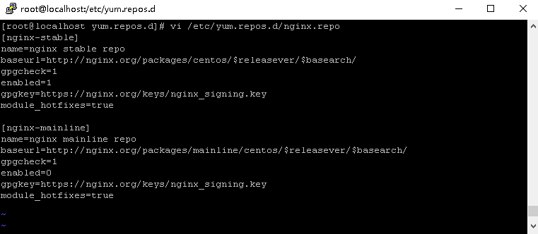 1、登录系统后执行 vi /etc/yum.repos.d/nginx.repo 编辑nginx的yum源。从ngix官网复制相关内容粘贴后输入":wq"保存并退出。