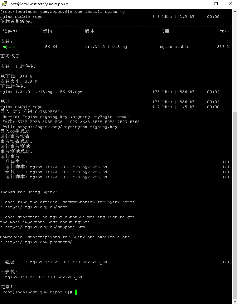 2、执行yum install nginx -y 安装nginx。