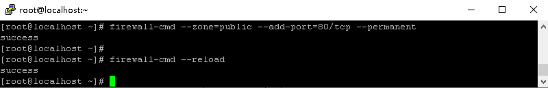 5、执行firewall-cmd --zone=public --add-port=80/tcp --permanent开启防火墙80端口。